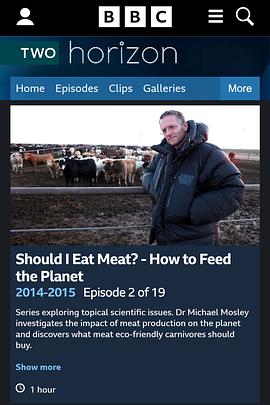 Dr Michael Mosley seeks to establish the truth about meat. Every year, humans raise and eat 65 billion animals - nine animals for every person on the globe. In this eye-opening documentary, Michael examines the impact that this is having on the planet and finds out what meat eco-friendly carnivores should be buying. Is it better to buy free-range organic or factory-farmed meat?...收起